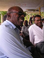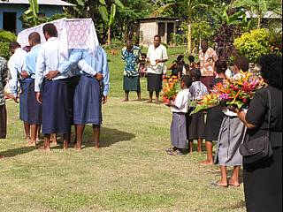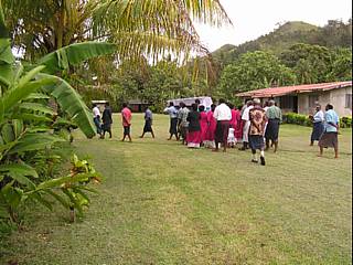 They carry the coffin thru the koro. Twice the procession is confronted by en-grieved men presenting tabuas, whale's teeth, the highest form of tribute.